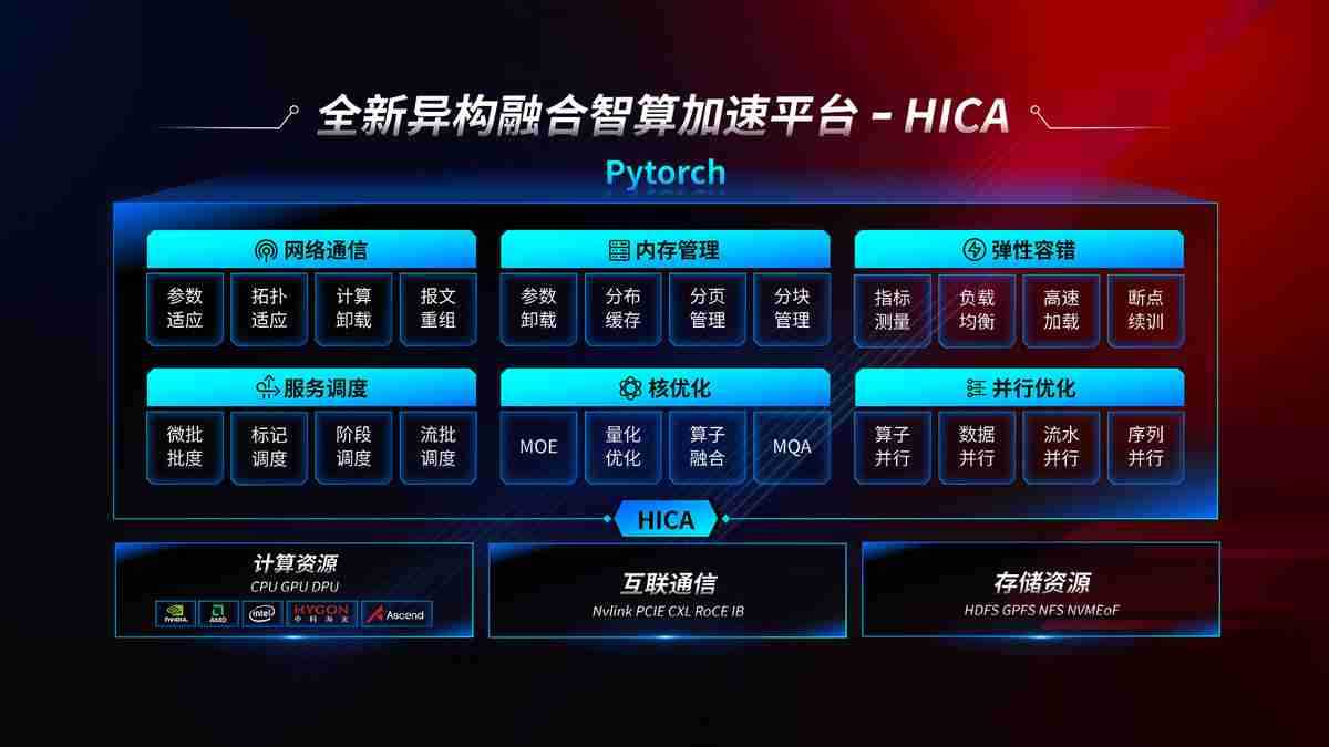 通过自研的服务层、、、、中间适配层、、以及调度编排算法,,采用数据并行、、、模型并行等多种并行方式,,把并行计算任务进行有效的分解,,,,使其分别由相应的软件栈和算力资源来承接。。当GPU资源变化,,,,HICA可以实时动态调度计算子任务并调整模型拓扑和架构,,以充分聚合各种算力资源。。。