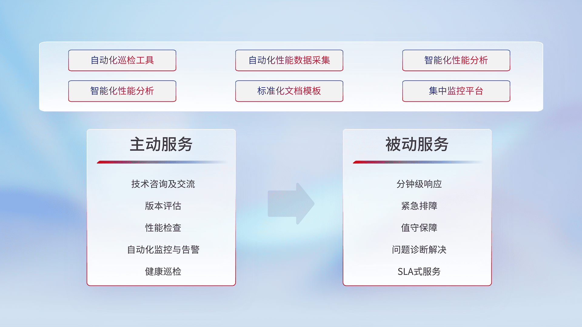 智能化工具和标准化文档,,,保障服务质量,,,提供主动服务(包含技术咨询、、版本评估、、、、性能检查、、、、自动化监控与告警、、、健康巡检)和被动服务包含(分钟级响应、、、、紧急排障、、、值守保障、、、、问题诊断解决、、、、SLA服务)。。。。